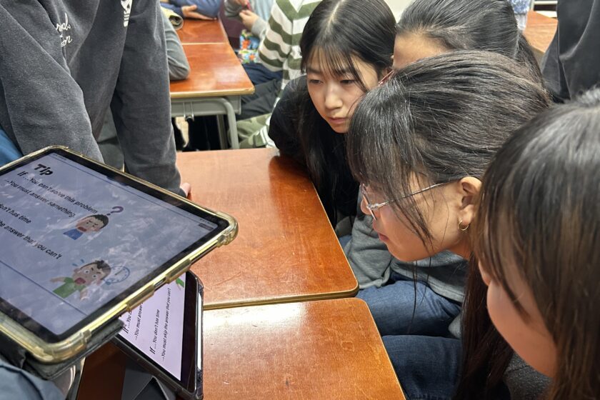 「わくわくShow And Tell」は、中学校の生活の楽しさや行事の面白さ、修学旅行やその他のイベントなどを、中学生がiPadを使って6年生に英語で説明をしてくれるものです。来年中学校に進学する6年生が、少しでも安心して飛び込んで来られる様に、お兄さんお姉さんが楽しめるプレゼンテーションを用意してくれます。