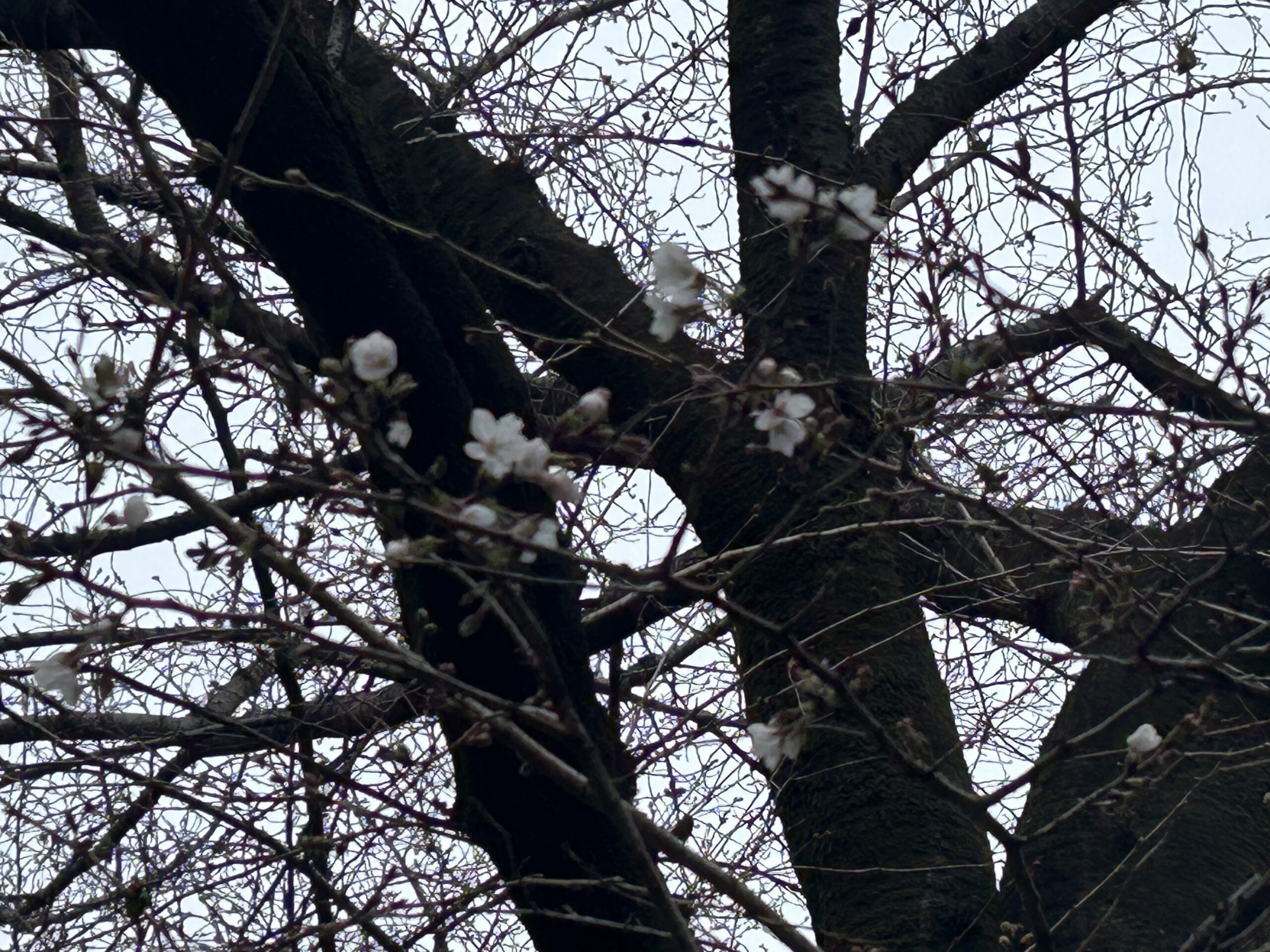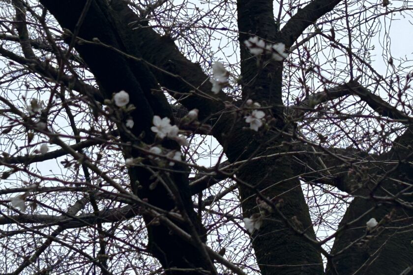 サクラ通りのサクラの木は、卒業を祝うかのように、ソメイヨシノが数輪ほころんでいます。