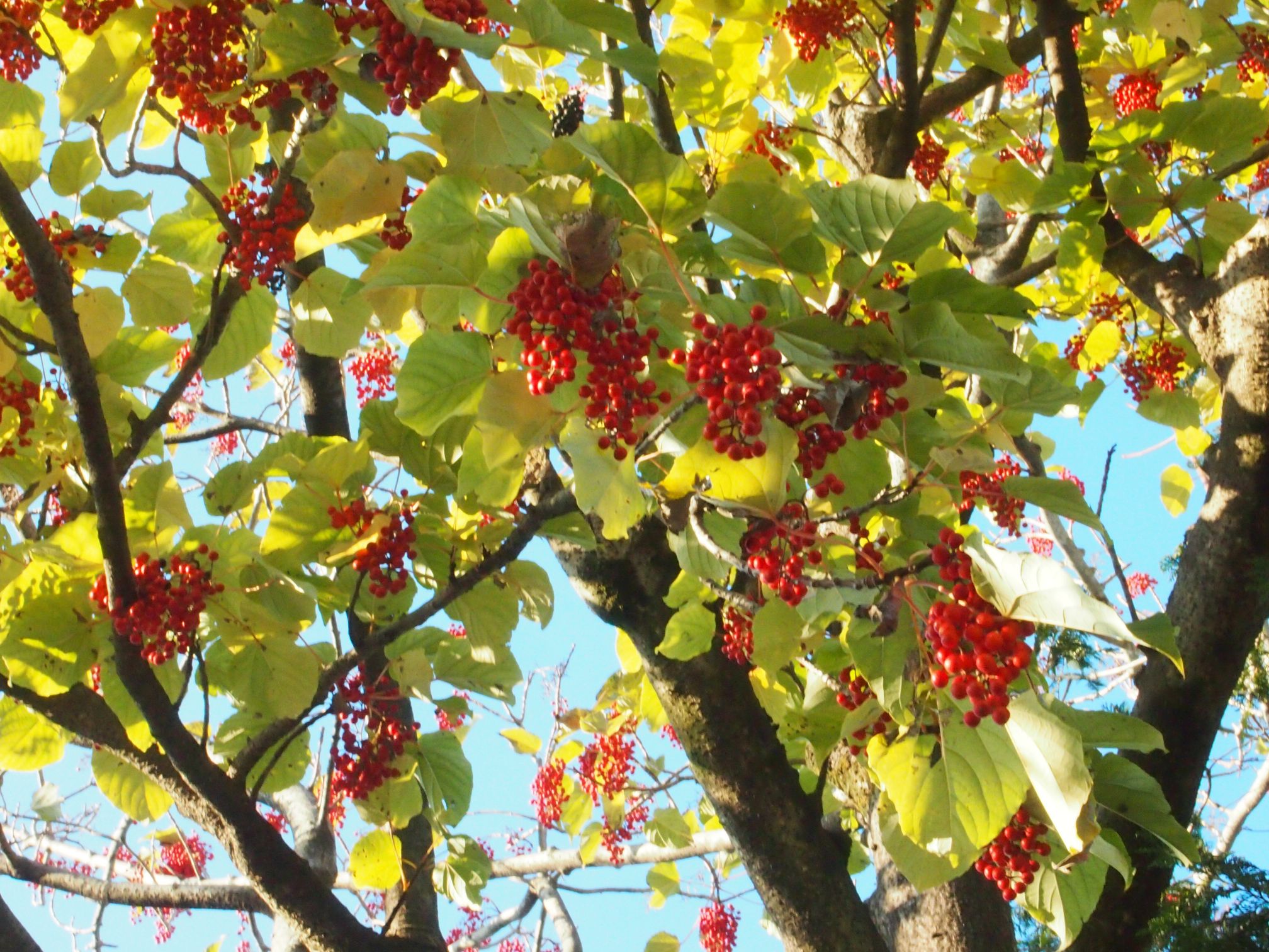 赤い実が房になって、とても美しい姿を見せてくれたのは「イイギリ」。美術室の裏の目立たないところで毎年秋にこんな鮮やかな姿を見せてくれているのです。中学校職員室前、グラウンドとの境には何本もの樹木が並んでいますが、美しい黄葉を見せてくれているのが「コナラ」の木。ごつごつとした樹皮も特徴です。