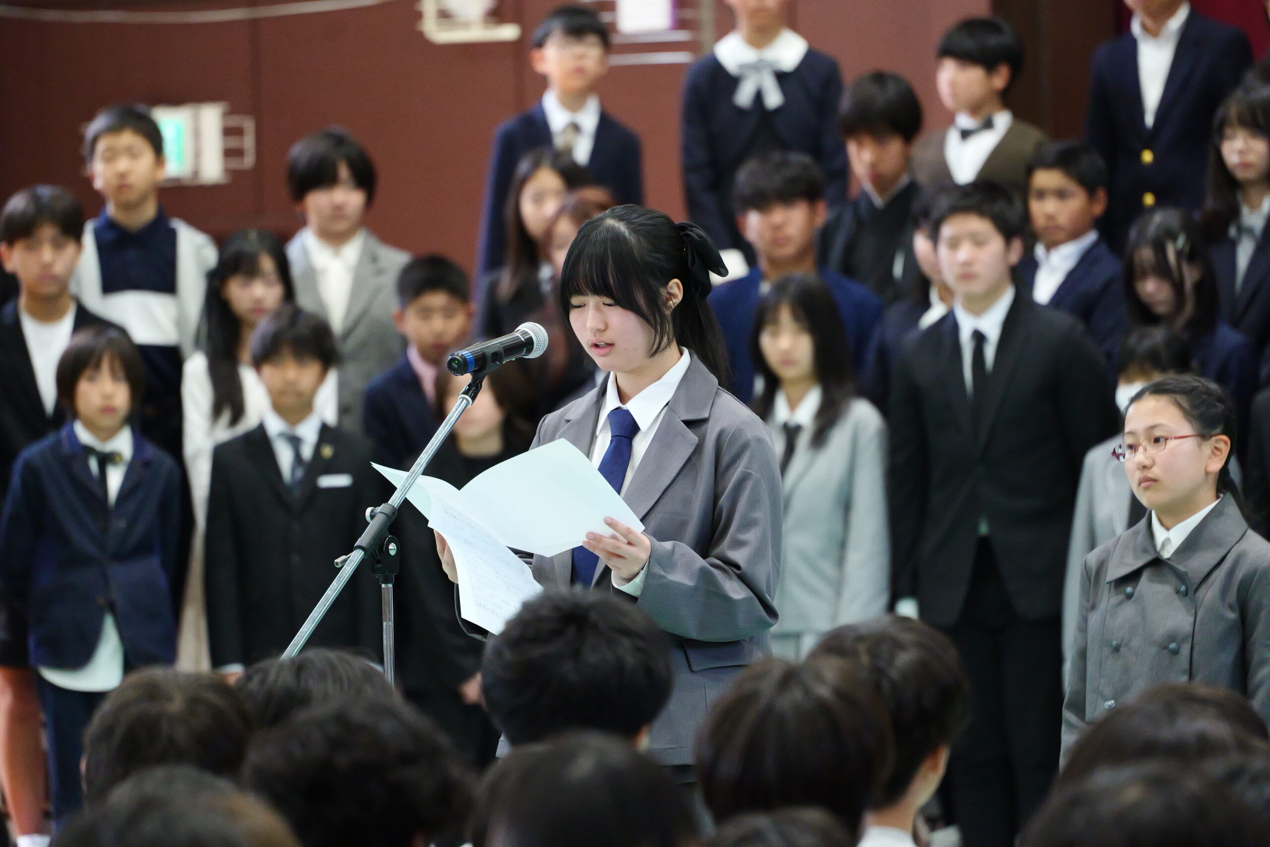 最後に、保護者の皆様、先生方、先輩方、そして、私たちを支えて下さる周りの方々には、私たちの成長を温かく見守って下さると嬉しいです。これから、私たちは、明星学園の教育理念である「個性尊重」・「自主自立」・「自由平等」の三つを大切にしながら、明星学園の生徒として、精一杯頑張っていきます。