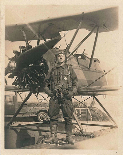 それと、明星学園に、戦没者の慰霊碑が建つことを願っています。資料整備室の入り口には、戦闘機の前に立つ軍服姿の卒業生の写真が掲げられています。写っているのは、10回生の村上直彦さん。19歳の正月に撮影され、上田先生に送ったものだそうです。裏面には「海軍一等飛行兵・村上直彦」と署名が残されています。